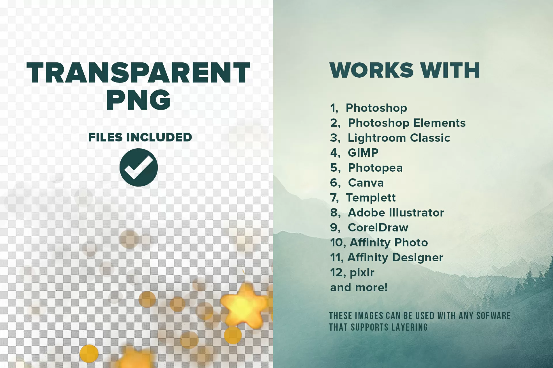 Our transparent overlays are delivered in high-resolution PNG format, ensuring crisp and clear details for your projects. They are compatible with popular design software such as Photoshop, Photoshop elements, Canva, GIMP, and more, making it easy to incorporate them into your creative workflow.