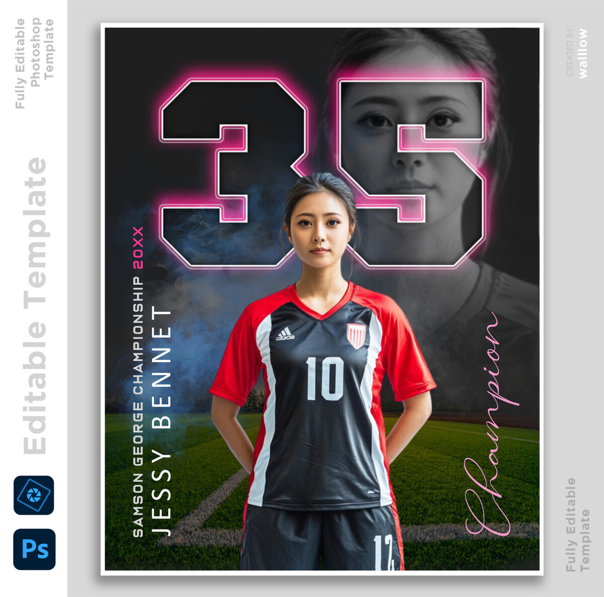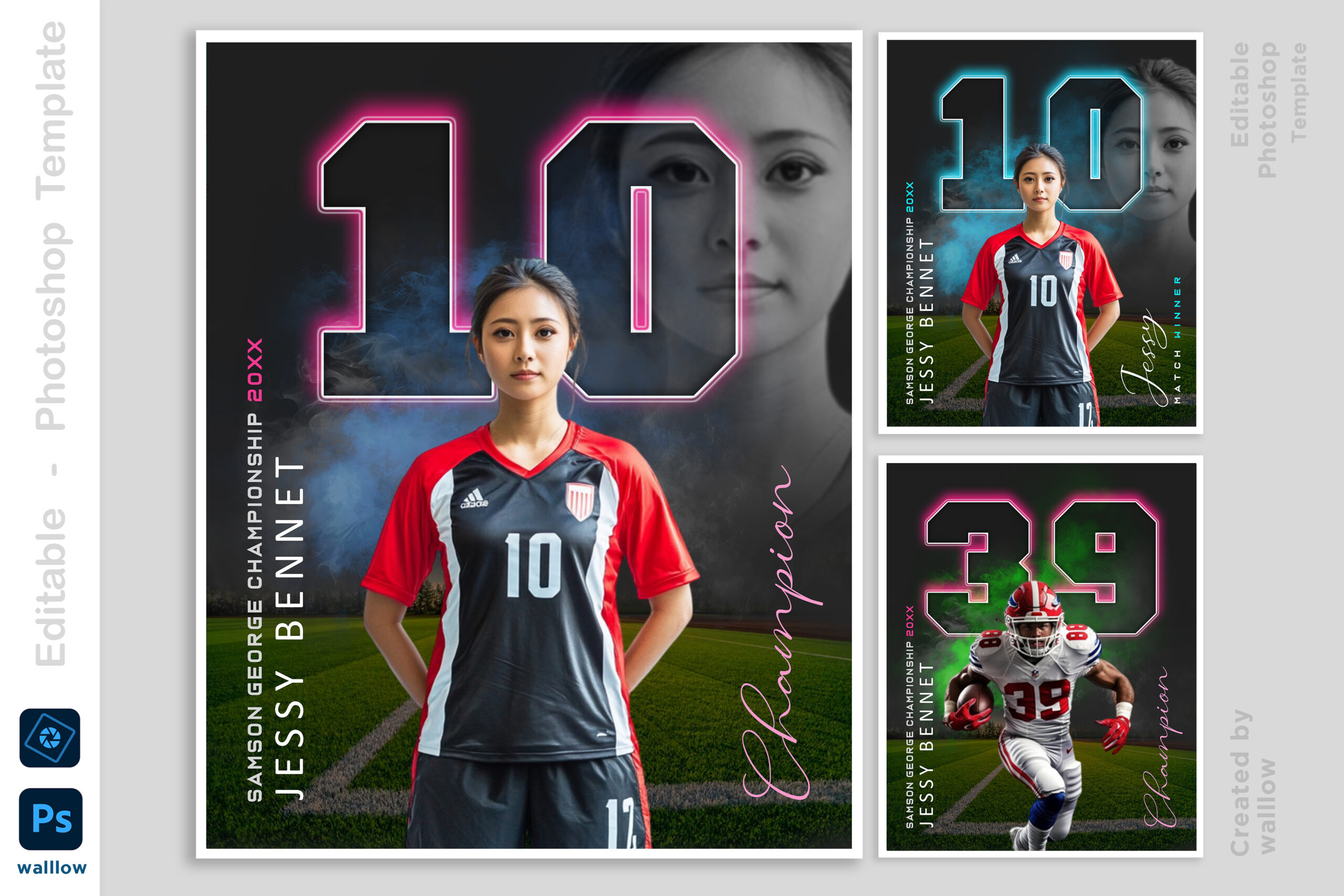 Create stunning and professional sports banners with this fully editable Photoshop PSD template. Perfect for sports photographers, designers, and athletes, this high-resolution template allows easy customization of text, colors, and images. Whether you’re designing a custom sports poster, team banner, or senior athlete tribute, this template provides a sleek and professional look. The layered PSD file ensures effortless editing using Adobe Photoshop. Ideal for football, baseball, soccer, and more, this template is designed to make your sports graphics stand out. With its high-resolution quality and smart object layers, you can create eye-catching designs in minutes. Created at 16×20 inches with a high-resolution 300 DPI, this template delivers sharp details and professional quality. Elevate your sports photography or promotional materials with this premium PSD template today!